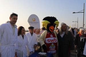 Am 9.März 2026 um 17 Uhr versammelten sich bei bestem Wetter zahlreiche Menschen im Bademantel! Vor Ort war neben vielen Akteuren der Selbsthilfegruppen und der Bremerhavener Selbsthilfekontaktstelle, dem Pflegestützpunkt, anderen städtischen Einrichtungen und Vertretern aus Politik und Wirtschaft auch die STÄWOG mit einem Tee und Süßigkeiten Angebot. Nicht zu vergessen die Maskottchen der Eisbären und der Pinguins!